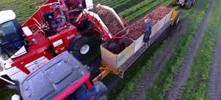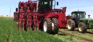▲胡萝卜收获机械,收割的胡萝卜通过传送带运到卡车里