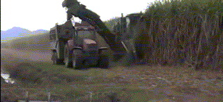 ▲玉米收获机械,收割的玉米通过传送带运到卡车里