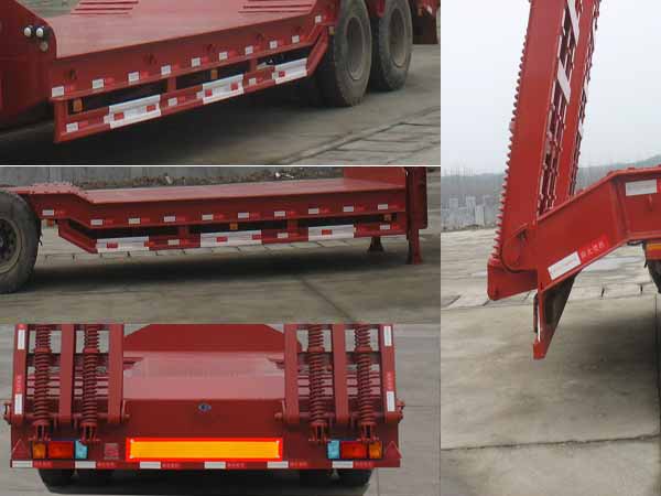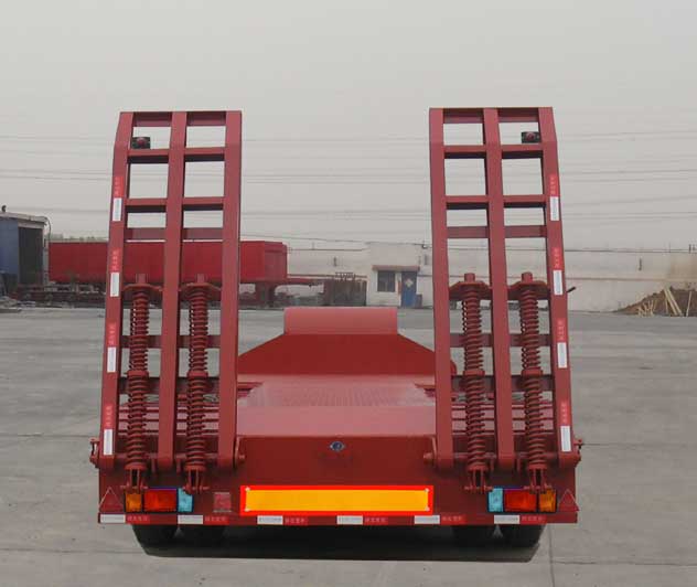 低平板半挂车车载部位无栏板,用途广泛,主要用于中长途货运运输。系列半挂车车架为穿梁式结构,纵梁采用平直式活鹅颈式。腹板高度从400mm至550mm,纵梁采用自动埋弧焊焊接,车架采用喷丸处理,横梁穿入纵梁并焊接整体。串联式干板弹簧和悬挂支座组成,结构合理,具有较强的刚性和强度,用来支承载荷缓冲击。