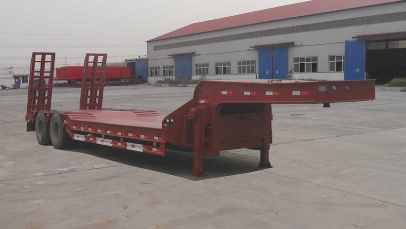 低平板半挂车通常用来运输重型汽车(如牵引车、大客车、专用汽车等)、轨道车辆、矿用机器林业机器、农业机器(如挖掘机、推土机、装载机、铺路机、起重机等)及其他重载货物,其重心越低,稳定性和安全性越好,运输超高货物和通过头顶障碍的能力就越强。