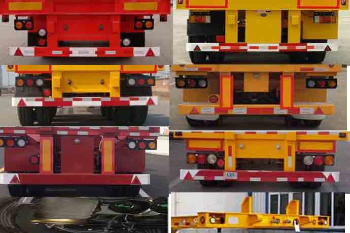 该车为大鹅颈结构,可运输一个20英尺集装箱或非危险品罐箱.货台空载离地高为1340mm.选装挡泥板样式,空气悬挂,导向块. 外形尺寸(mm)/轴距(mm)对应关系为:10800/6350+1310+1310、6150+1310+1310、5850+1310+1310;外形尺寸(mm)/轴距(mm)对应关系为:10300/6150+1310+1310、5850+1310+1310.ABS系统控制器型号:CM2XL-4S/2K(4S/2M);生产厂: 广州市科密汽车制动技术开发有限公司.侧面防护和后防护材料均为型钢Q235,侧防护与车身为:焊接连接,后防护与车身为:焊接连接,后防护主要尺寸参数160×30mm,离地高度510mm.