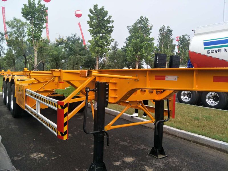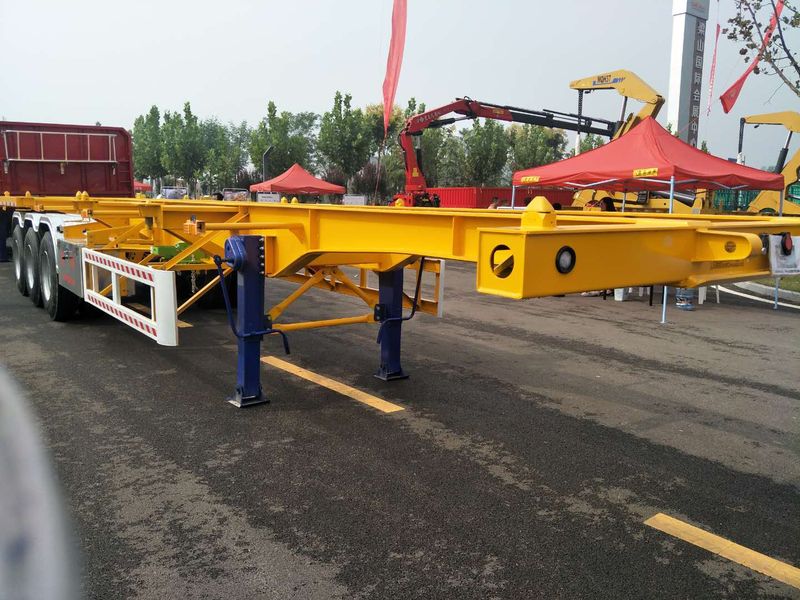 木系列集装箱运输半挂车的车架全部喷丸处理,整个车架是在专用的定位台架上组装、焊接而成,其结构合理、强度高、外形美观。在车架上设置了集装箱紧缩装置,可以装载40英尺、20英尺两种标准集装箱。前后端的四个集装箱紧缩装置为固定式结构,中间集装箱紧缩装置为可藏式结构。装载集装箱时,根据需要可将中间集装箱锁紧装置降低到货台平面以下。选用机械式承载装置,主要有宝华12T、20T;富华13T;JOST;等类型。其作用是当牵引装置与挂车脱开时,用于支撑地面,承受半挂车前部载荷。支承装置有单动式和联动式两种,主要由支承盘、螺杆传动机构、减速箱和操纵手柄等构成。