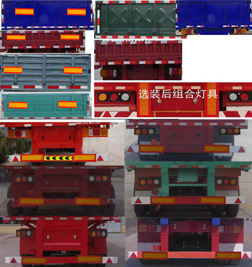 选装空气悬架.选装侧面样式,每边开数可选5开扇和6开扇,立柱可选内插和外插。整车栏板选装竖瓦楞、横瓦楞、方管平板、方管十字花样式。选装前部和后部样式,该车侧、前、后门样式可任意组合,轮胎可选装11.00R20 12PR,12R22.5 12PR。ABS系统控制器型号:CM2XL-4S/2K(4S/2M);生产厂: 广州市科密汽车制动技术开发有限公司.侧面防护材料为钢板3/Q235,与车身为螺栓连接;后防护材料为矩形管Q235,与车身为焊接连接,主要尺寸参数150×30,离地高度550mm. | |||